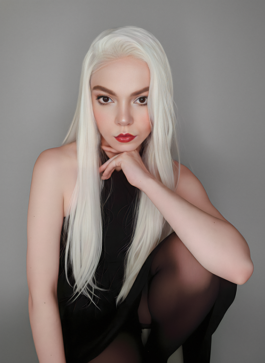 Arraste o divisor para ver a transformação. Partindo de uma foto de estúdio, a IA cria ambientes e estilos completamente diferentes — mantendo a mesma pose e expressão.
